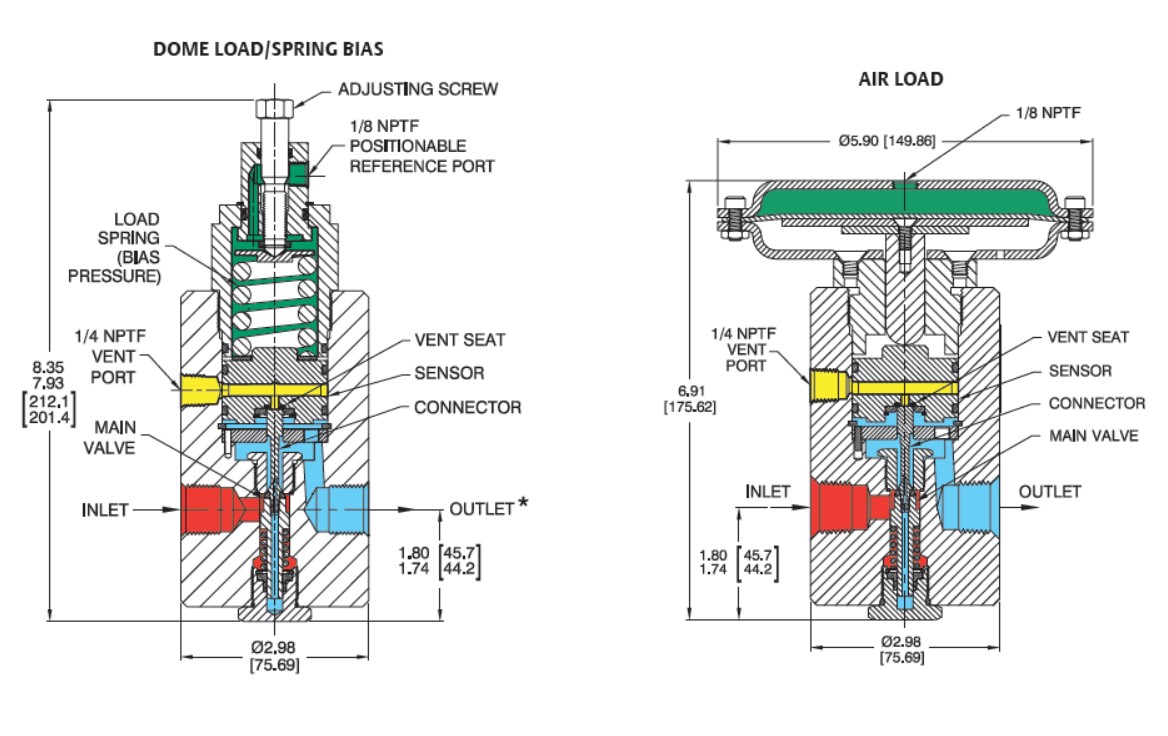 44-4000 dome loaded, spring biased regulator is designed for pressure tracking applications to maintain a constant differential pressure. Venting allows for pressure tracking increases and decreases. Ideal for use in diving applications for emergency breathing air.