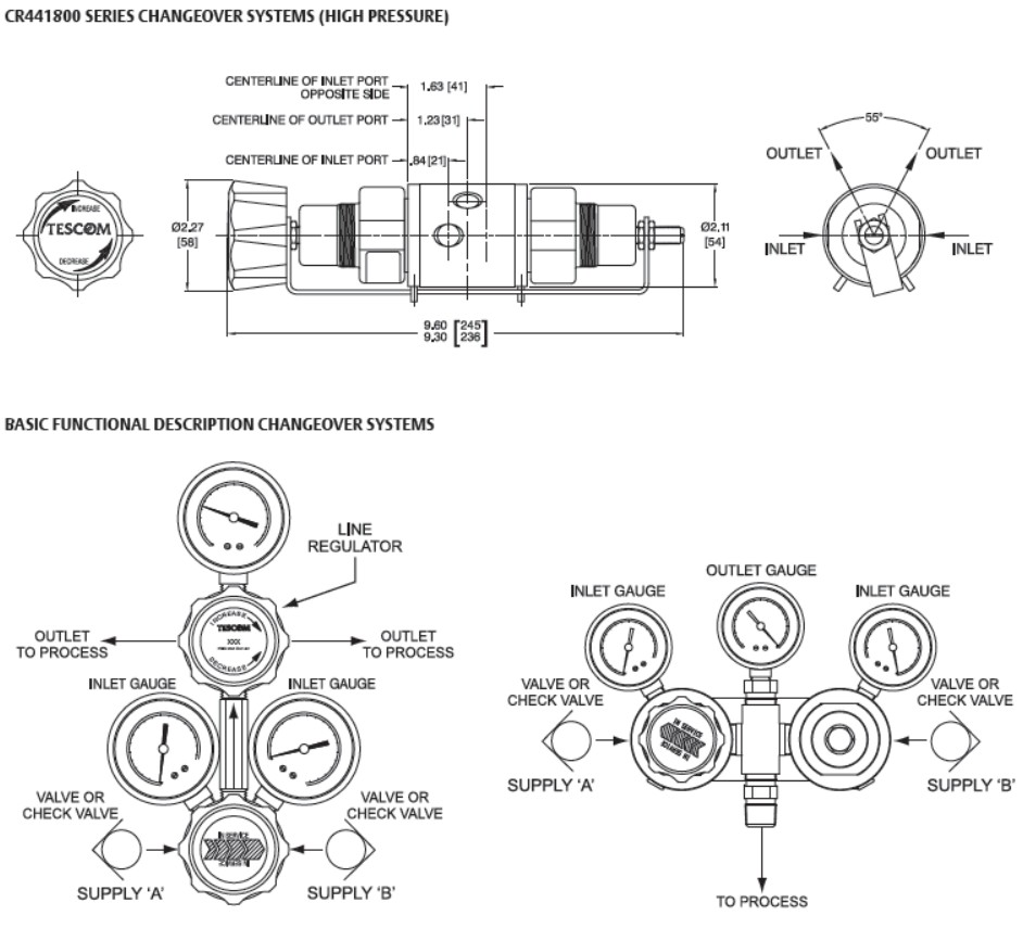 CR441800Series is a compact, high pressure changeover system which combines the changeover regulator and a line regulator into a compact wall mount system for general purpose and industrial gases. It provides continuous low flow of gas from two high pressure sources. Ideal for use in analyzer carrier gas and laser resonator gas applications.